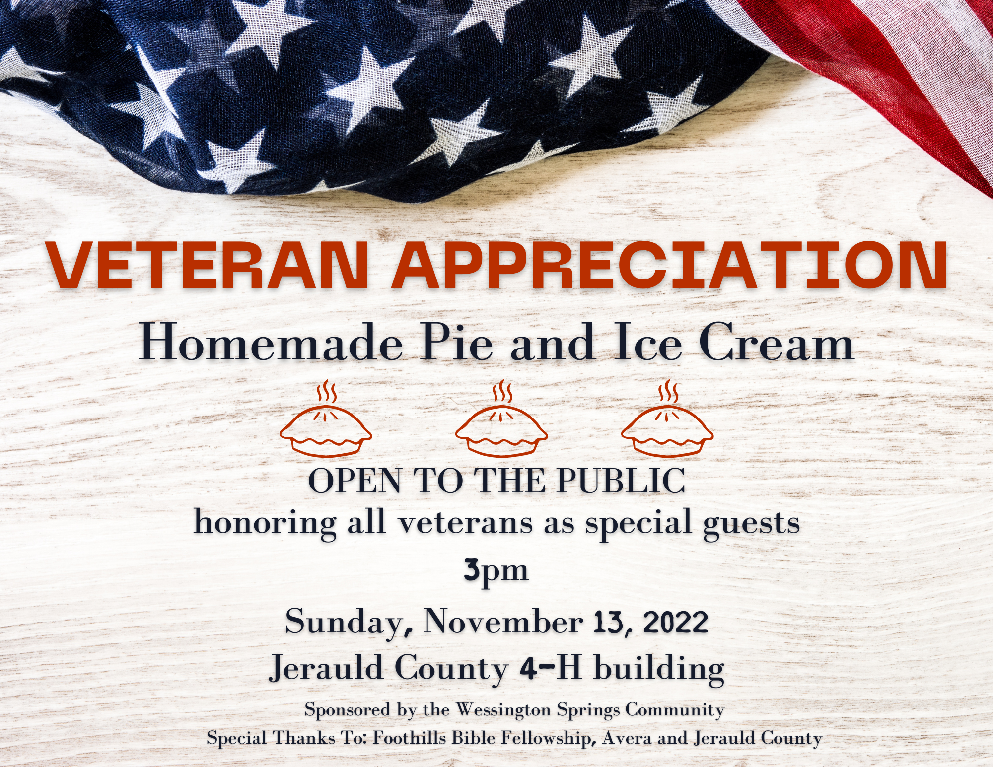 Back to All Events Veteran's Appreciation Sunday, November 13, 2022 3:00 PM 4:00 PM PO Box 132 230 Main Street East Wessington Springs, SD, 57382 United States (map) Google Calendar ICS